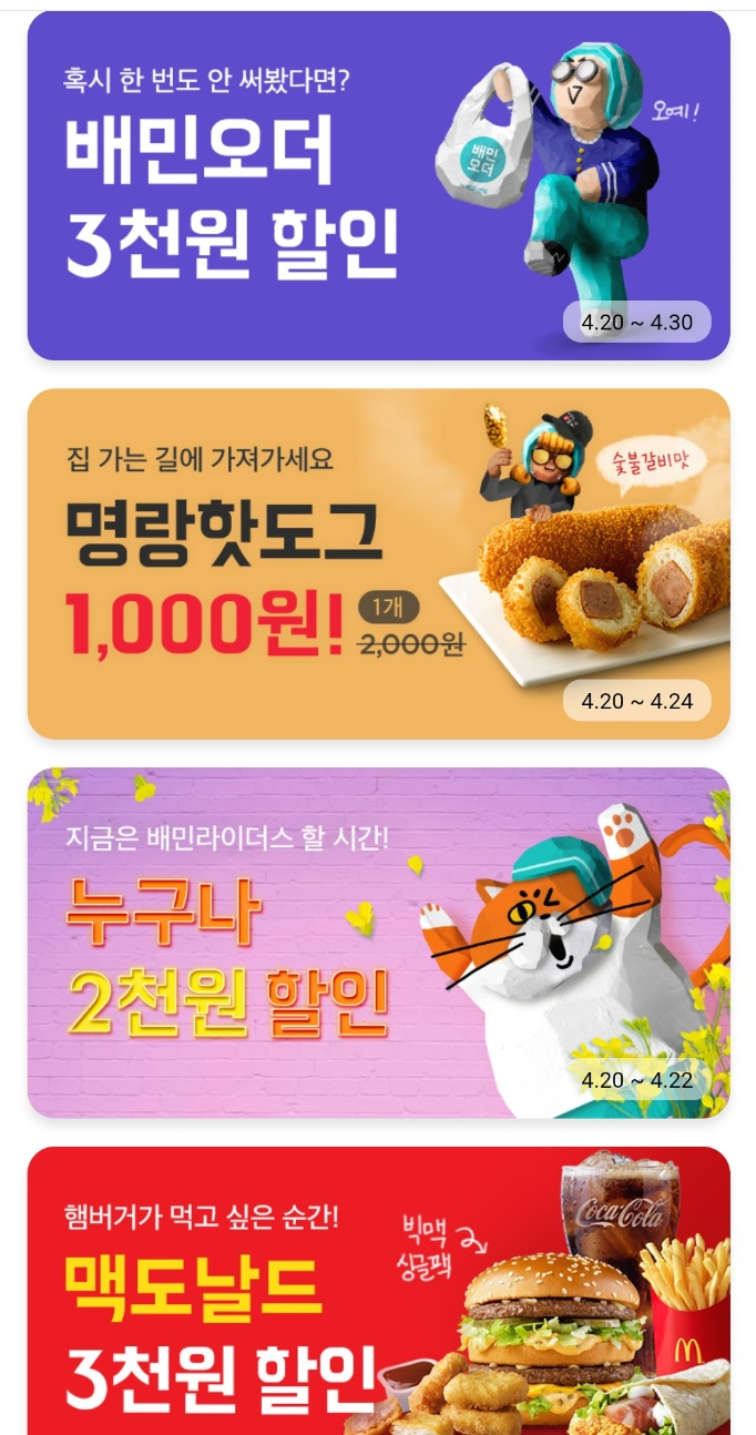 이외에도 현재 명량핫도그 1천원, 맥도날드 3천원 할인 이벤트도 진행되니 참고해주세요 .